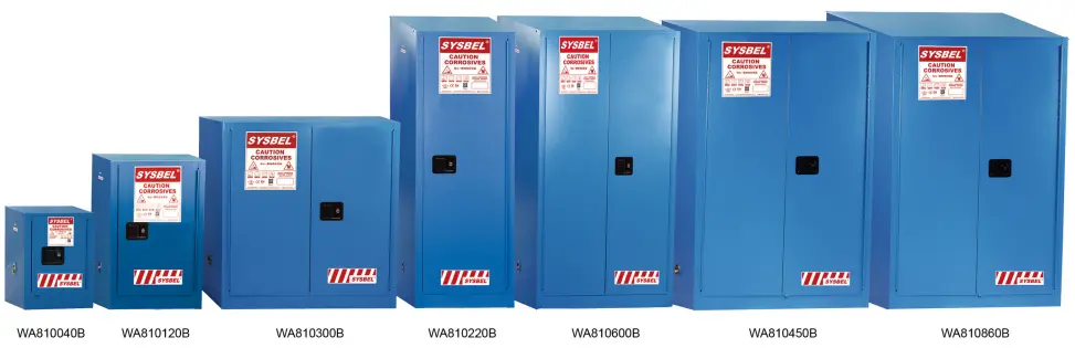 SYSBEL FM CE cabinets are available in types for flammable liquids, corrosives, acids/alkalis, and toxic chemicals, with sizes 4 Gal,12 Gal,22 Gal,30 Gal,45 Gal,60 Gal,90 Gal,110 Gal to suit different storage needs.