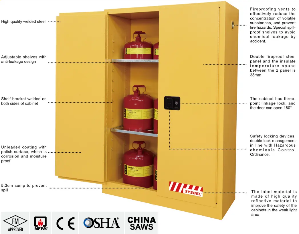 SYSBEL FM CE Certified Hazardous Chemicals Safety Storage Cabinets are designed to safely store flammable and hazardous substances in compliance with international safety standards. Built with high-quality steel and fire-resistant insulation, these cabinets help reduce the risk of fire, leakage, and chemical accidents. They feature secure locking systems, ventilation options, and clear hazard labeling, making them ideal for laboratories, industrial facilities, and workplaces handling dangerous chemicals.